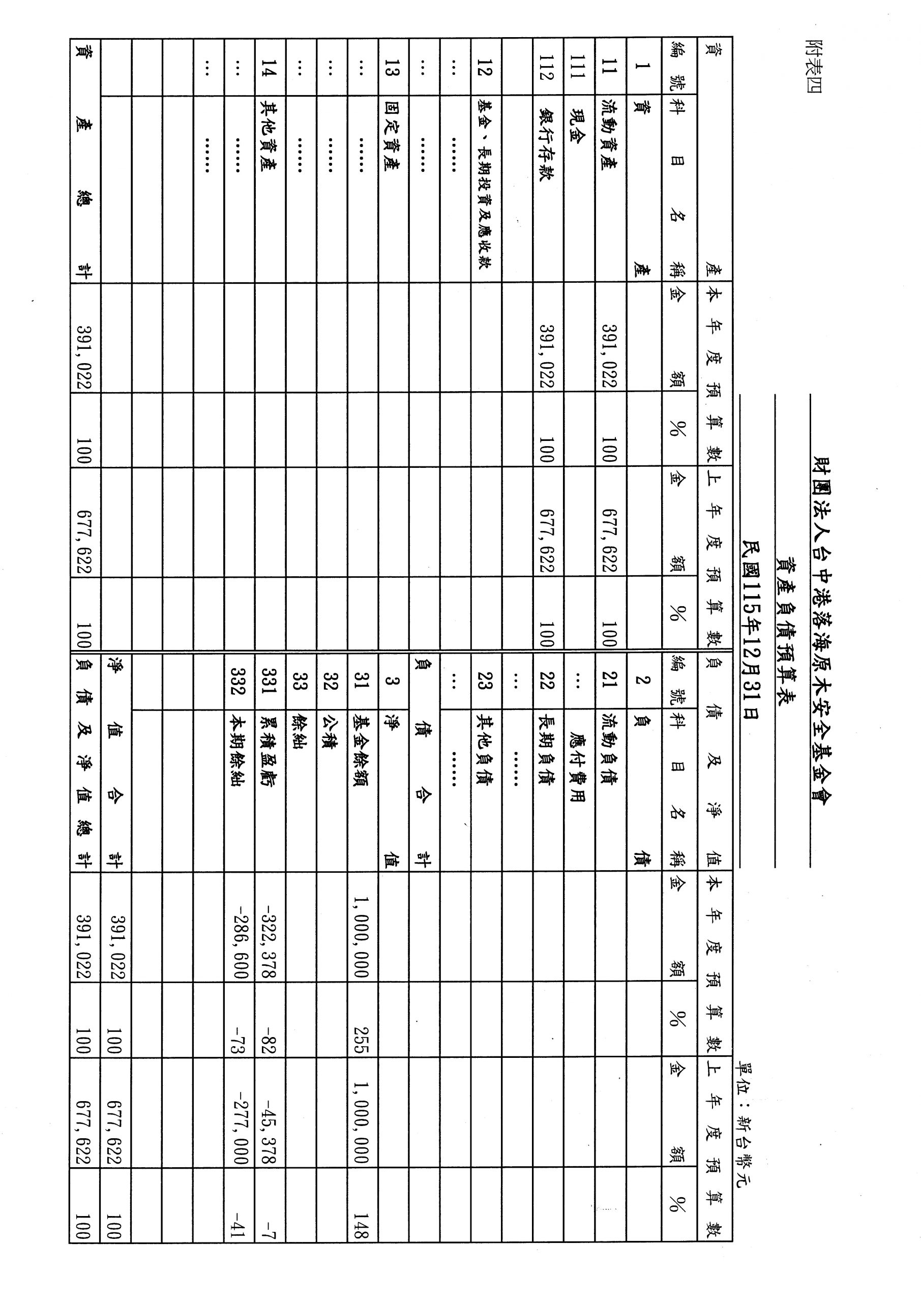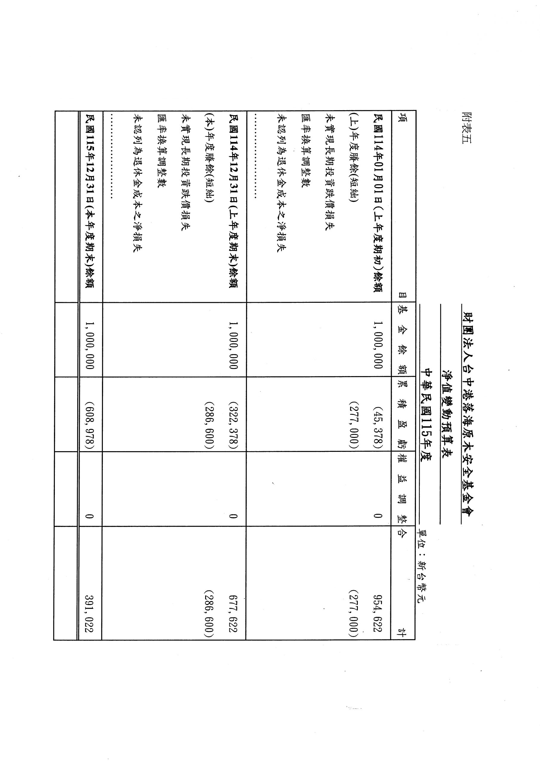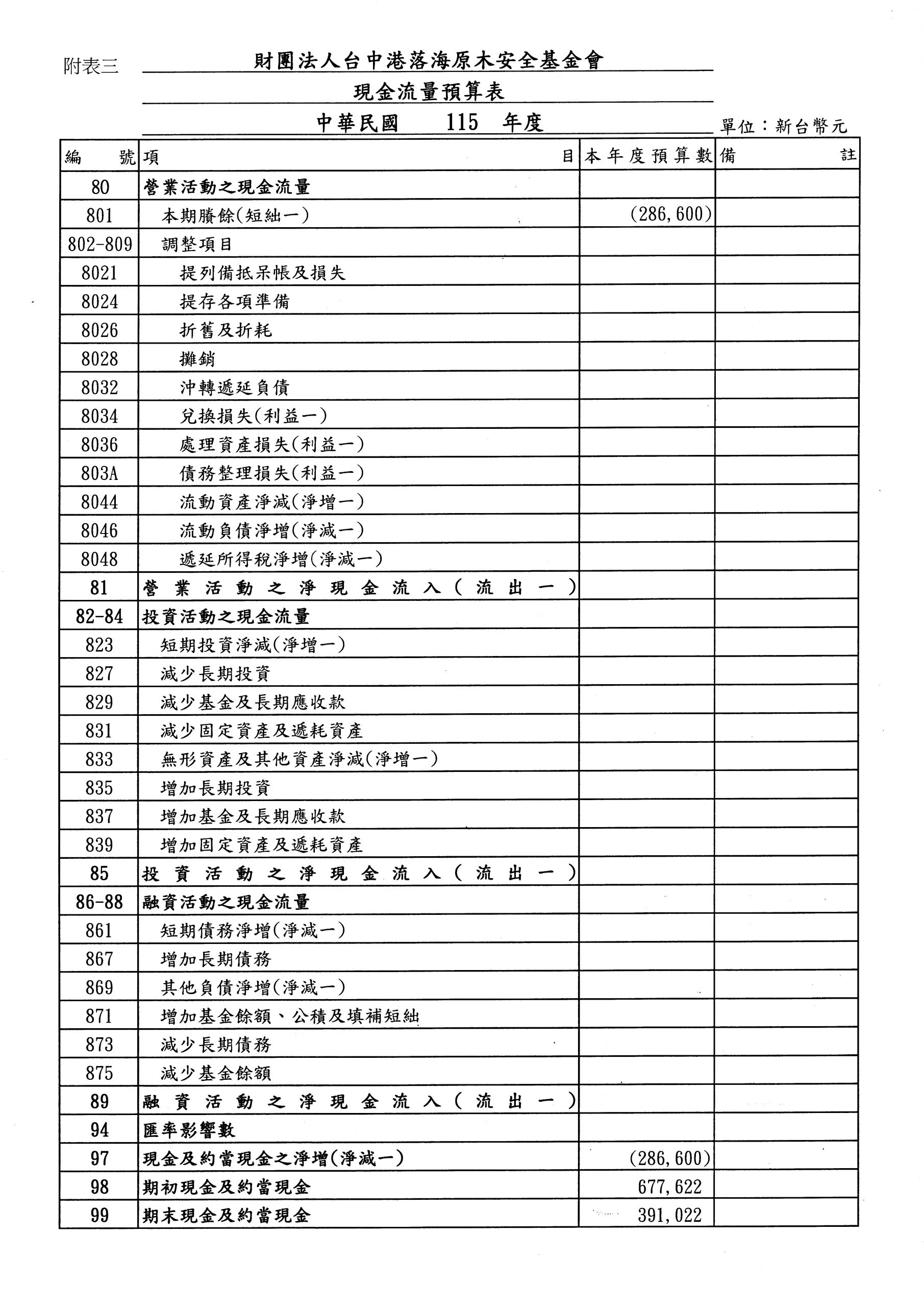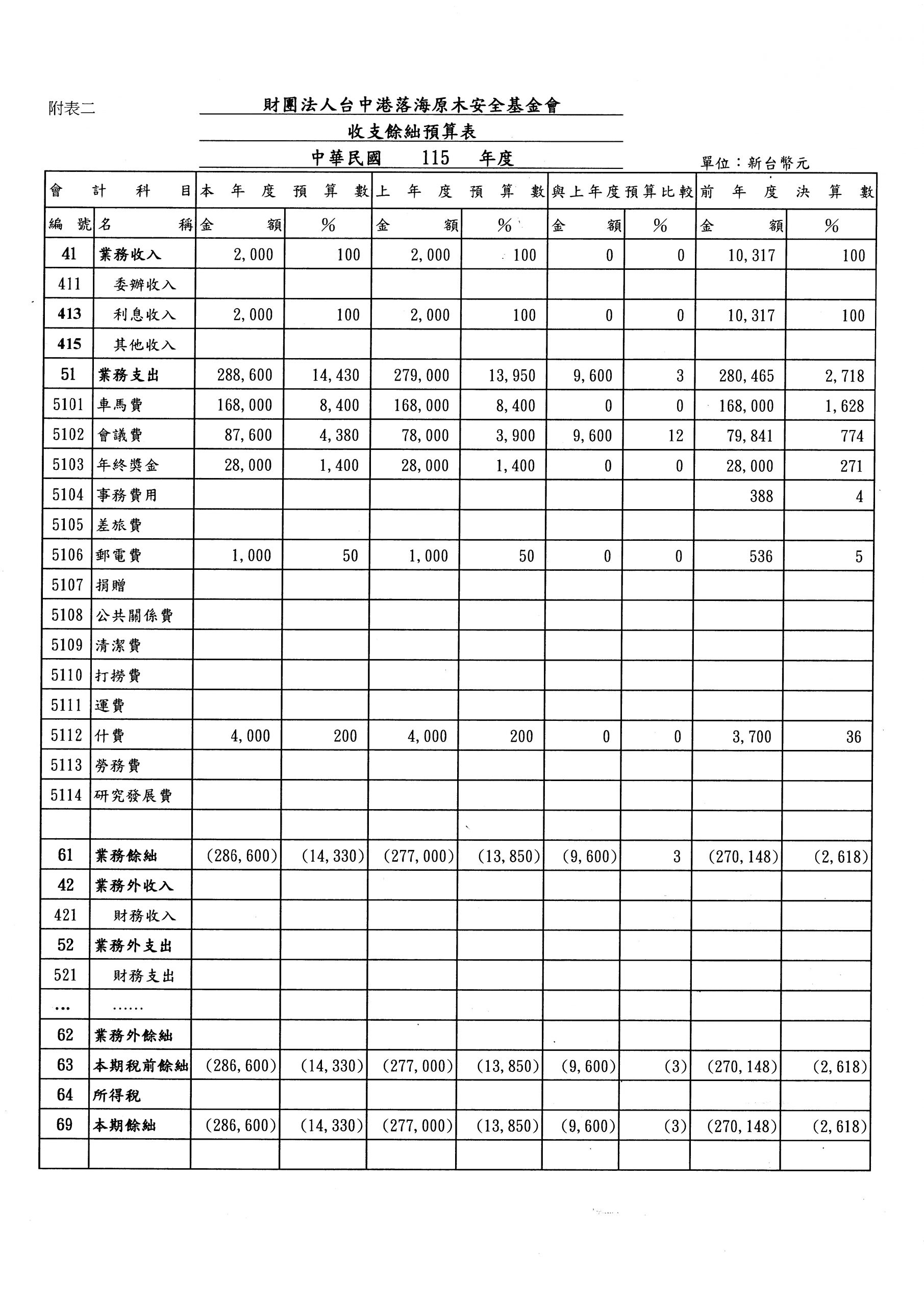 財團法人台中港落海原木安全基金會115年度收支餘絀預算表、工作計畫